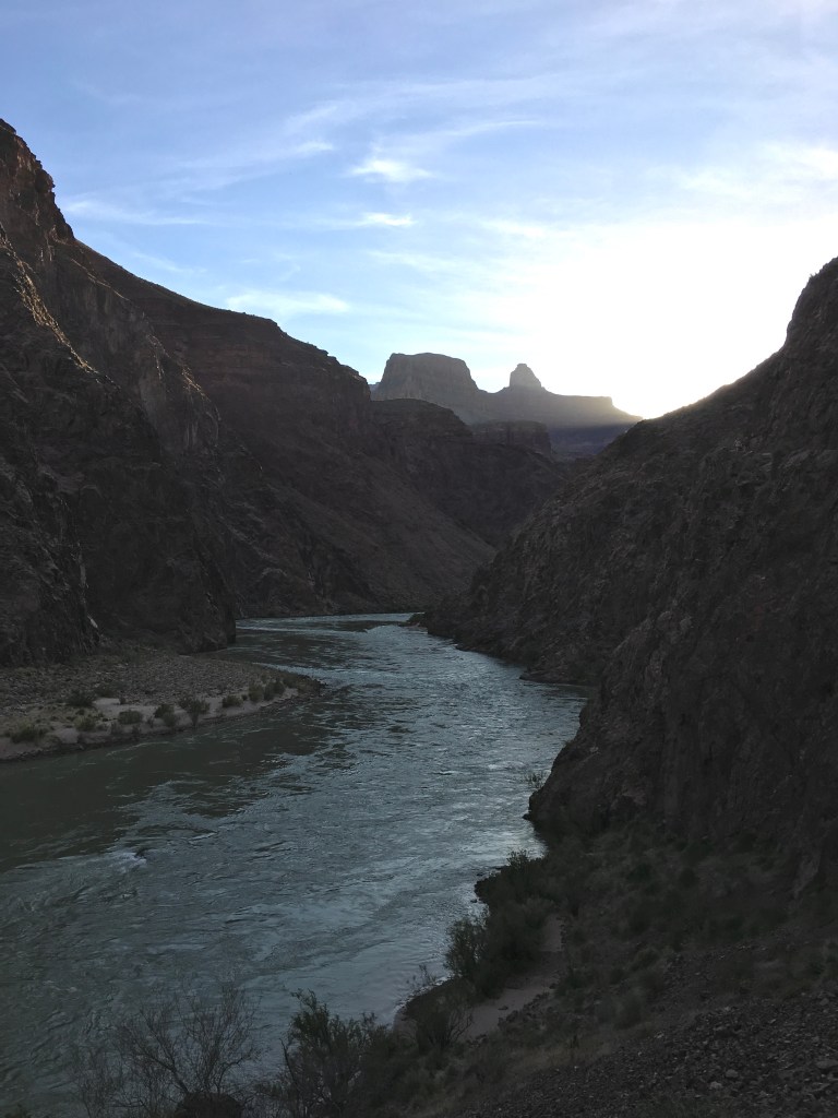 [Image Description: Shadowed canyon walls on either side of a river, blue sky, rock formations, and light from the rising sun in the background.]
